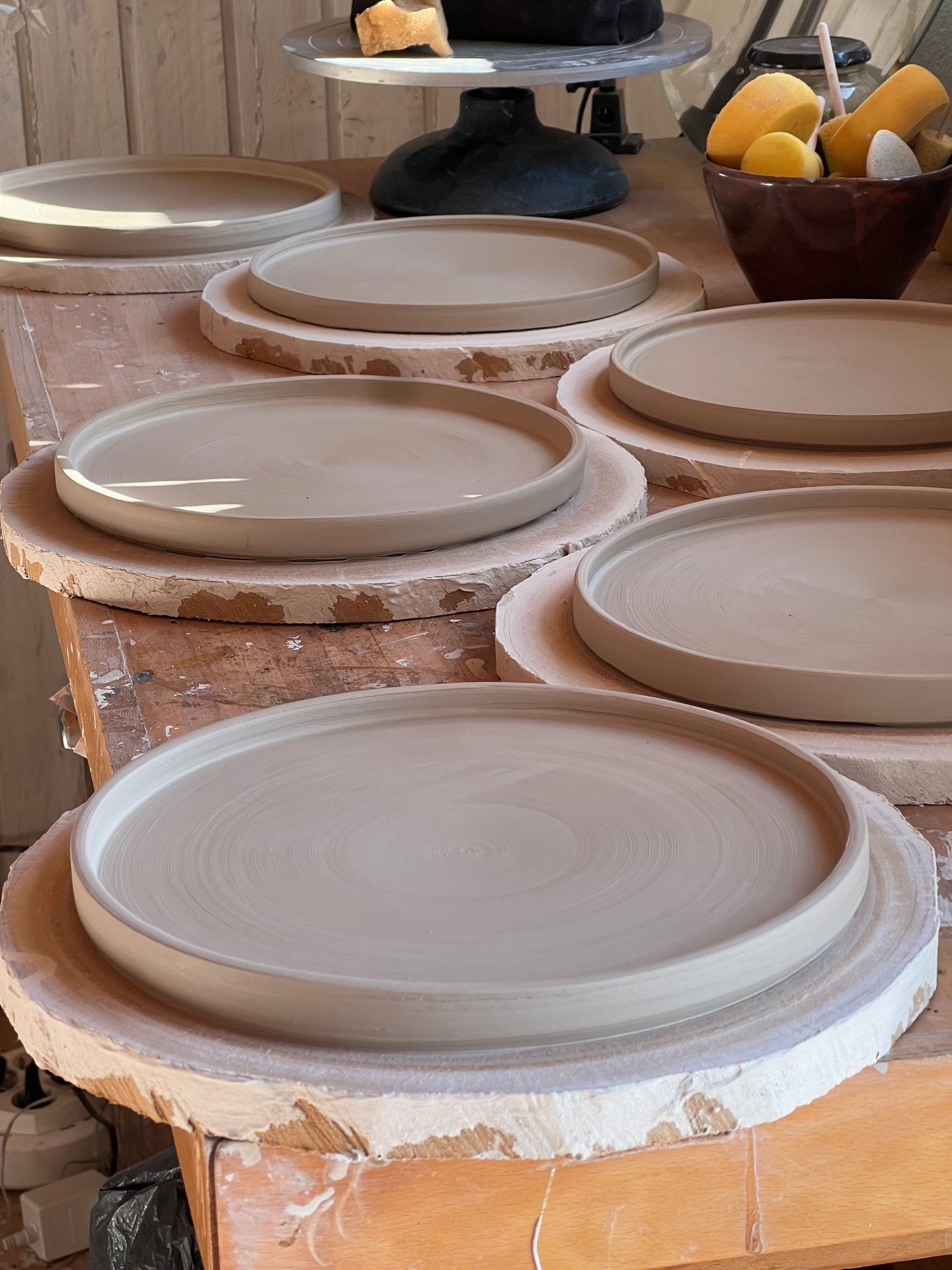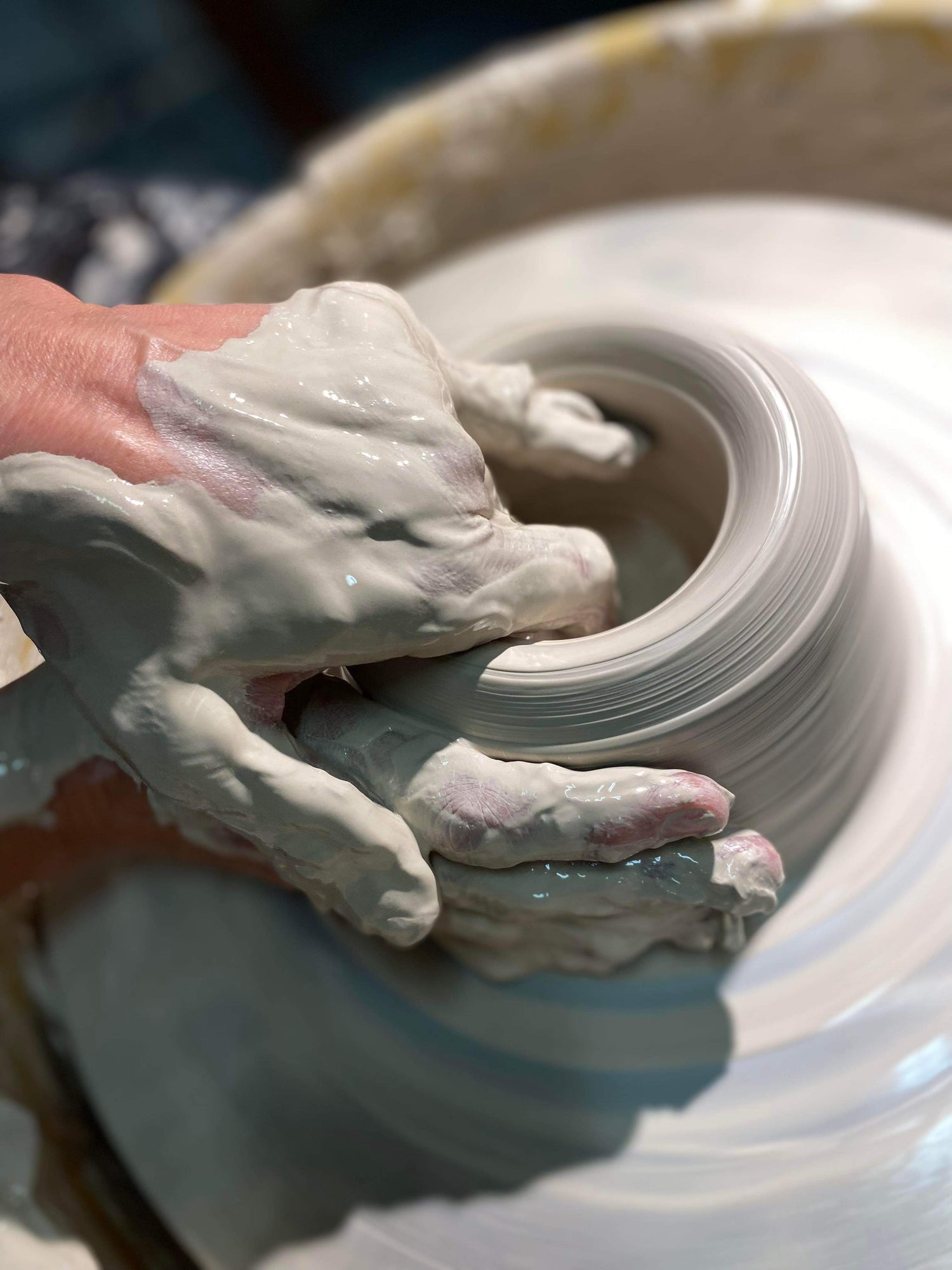 Därefter centrerar och formar jag leran på drejskivan. Form, storlek och proportioner bygger jag upp steg för steg. Hur lång tid det tar att dreja ett föremål varierar beroende på form och komplexitet.